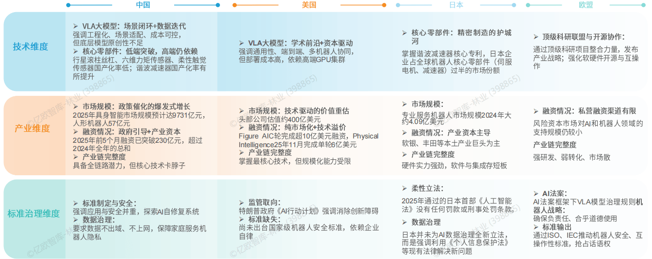 2025年,具身智能财产呈现中美双雄、欧日跟从的四维款式,构成中国场景驱动、美国手艺引领、只本硬件的差同化径。中国具身智能专利申请量居全球第一,2025年市场规模估计达9731亿元,但正在焦点零部件国产化率不脚20%;美国特斯拉、FigureAl和Physical Intelligence领跑手艺前沿;欧盟尺度制定处于领先程度,但缺乏本土领军企业;日本占领全球机械人焦点零部件60%~80%的市场份额,但正在人形机械人范畴反映迟缓。