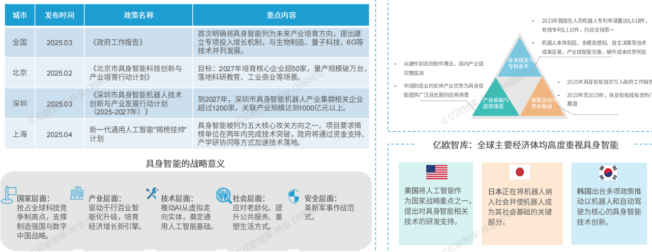 2025年,中国初次将“具身智能”写入工做演讲,标记着其正式上升为国度计谋,成为将来财产培育的沉点标的目的。全球次要经济体将以人形机械报酬代表的具身智能上升到国度计谋,通过跟进完美轨制扶植、供给资金补助等体例鞭策手艺成长。全球次要经济体均将具身智能列为科技成长计谋,高度注沉具身智能成长,不竭提拔细分范畴关心度。我国具身智能手艺取使用已走正在国际前列。
