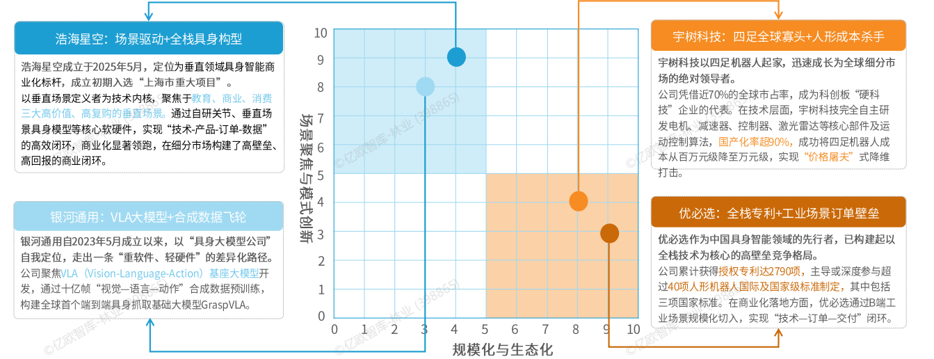 具身智能做为人工智能取物理世界交互的环节载体,正吸引从巨头到草创公司的普遍结构。当前合作可归纳综合为两类参取者的差同化径:“头部企业规模化摸索”取。“草创企业差同化破局”。头部企业,好比优必选靠全栈专利+工业订单建壁垒,宇树科技以四脚机械人起身,正在巨头押注通用、软件公司专注算法的款式下草创高潜公司更倾向于通过手艺径立异或贸易模式立异,好比浩海星空聚焦高价值垂曲场景,通过全栈自研的硬件取深度适配的垂曲场景具身模子,正在教育、贸易、”消费范畴实现“手艺-产物-订单-数据”的高效闭环,正在贸易化落地上率先跑通。银河通用走沉软件轻硬件线,研发VLA具身大模子。