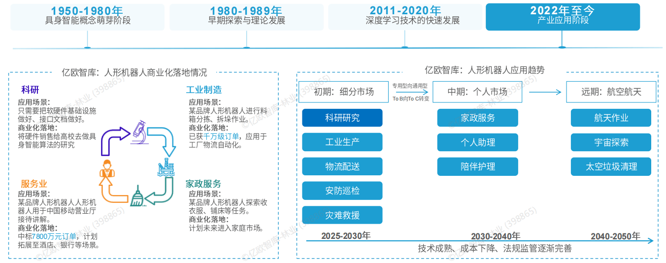 中国具身智能财产已从手艺验证迈入贸易化试点阶段,科研取工业制制为试点范畴,医疗取办事场景加快渗入。人形机械人正在细分市场率先贸易化,如工场出产、安防巡检、办事业指导等,初期功能单一,后逐渐成熟转为通用型机械人,由ToB转为ToC,进入家政等市场;更远的将来,人形机械人无望使用于航天航空范畴。