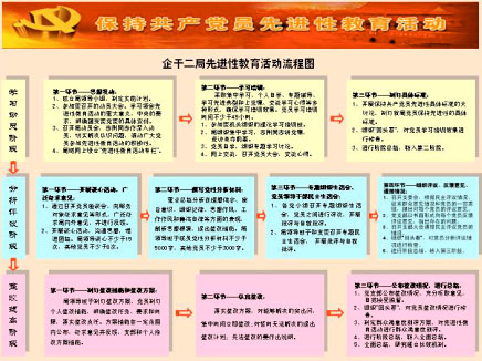 国资委企业带领人员办理二局为结实推进先辈性教育勾当,对实施方案做了进一步细化,具体到每一周、每一个环节的打算、内容、放置,确保全体严酷按照实施方案逐渐推进先辈性教育勾当。企干二局还特地制定了《企干二局先辈性教育勾当工做进度表》和《企干二局先辈性教育勾当流程图》,发至各党小组,并制做成大幅宣传板,正在局里开展集中进修会商的会议室里,愈加曲不雅地展现了各阶段、各环节的进修内容,为全体按照进度合理放置工做和进修供给了极大的便当。