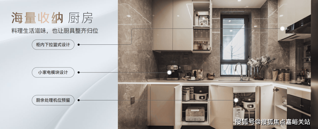 橱柜收纳系统:出格预置洗碗机点位、柜内下拉篮式设想、不锈钢挡油板、柜下操做灯、烹调全流程功能动线一体化设想。