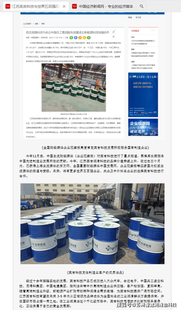 12月5日下战书姑苏优良平易近营制制企业江苏英吉润滑科技无限公司取世界五百强尼得科集团的合做登上了全国支流财经中国经济旧事网官网首页和资讯频道前五,这是三个月以来中国经济旧事网第二次沉点报道英吉科技,这是国度权势巨子财经对英吉科技持久办事中国经济工业成长的承认。英吉科技凭仗自从研发的高端润滑材料手艺,已成功配套办事高端配备、高端数控、新能源动力电池等计谋性新兴财产客户,其处理方案普遍使用于世界五百强尼得科出产线,