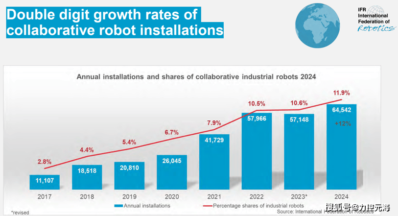 我们都晓得,机械人不只能精准施行反复性使命,更能通过视觉系统“察看”出产非常,以至取其他设备“对话”优化整条产线。因而,将来机械人可能有有以下几个趋向:按照国际机械人结合会(IFR)发布的《2025世界机械人演讲》,2017年协做机械人年安拆量仅11,107台,2024年增至64,542台,七年时间实现近6倍增加。这些“同事型”机械人无需平安围栏,间接取人类共享工做空间,承担起细密拆卸、质量检测和物料搬运等使命,人机协同模式无效填补了保守工业机械人矫捷性不脚的短板。